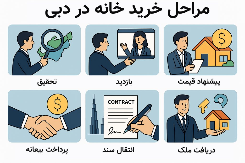 اگر بخواهیم «مراحل خرید ملک در دبی» را ساده کنیم، سه ایستگاه اصلی داریم: انتخاب ملک مورد نظر، قرارداد اولیه و انتقال سند. در گام نخست با توجه به بودجه، کاربری و بازده اجاره، جستوجوی خود را در میان املاک دبی آغاز کنید. سپس با مشاور املاک معتبر مذاکره کرده و پس از توافق، مبلغ بیعانه پرداخت میشود. در مرحله بعد، بررسیهای حقوقی و فنی انجام و قرارداد رسمی تنظیم میگردد. در نهایت در دفتر توسعهدهنده یا مرجع رسمی، سند به نام خریدار منتقل میشود و شما صاحب ملک میشوید.