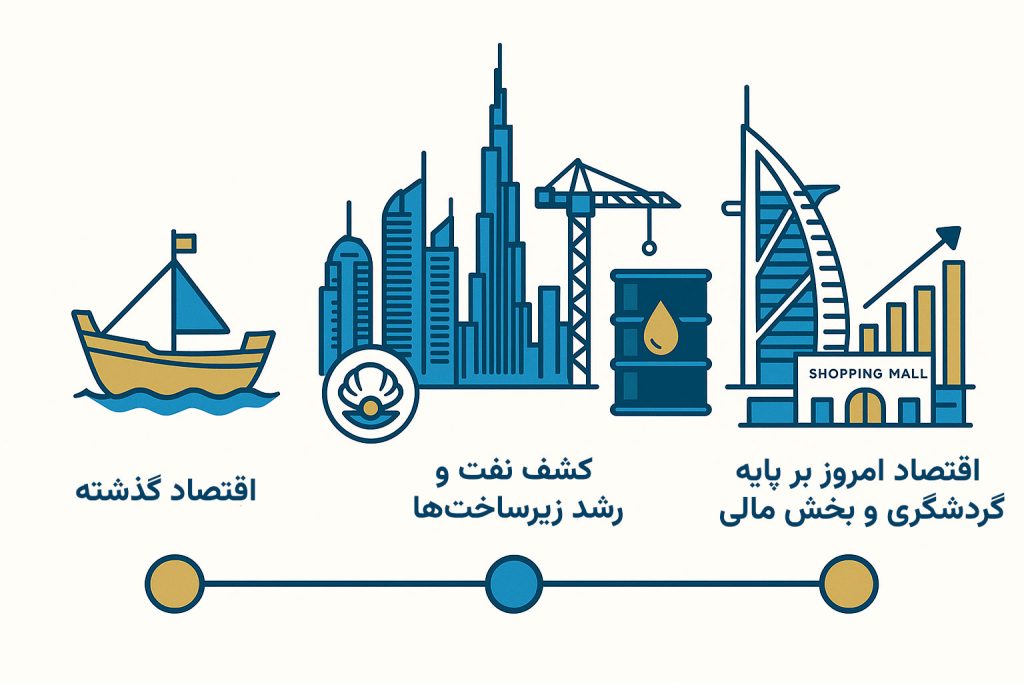 اقتصادی شهر دبی در ابتدا بر پایه ماهیگیری و تجارت مروارید بود. اما با کشف نفت، دبی فعالیتهای گستردهای را در زمینه زیرساختها آغاز کرد. امروزه اقتصاد دبی دیگر متکی به نفت نیست و بیشتر بر گردشگری، مراکز خرید دبی، بهترین هتل های دبی، و بخش مالی استوار است.