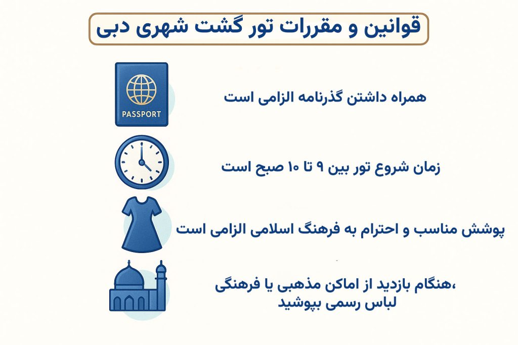 قبل از شرکت در تورهای گشت شهری دبی، بهتر است با برخی قوانین و مقررات تور آشنا شوید: