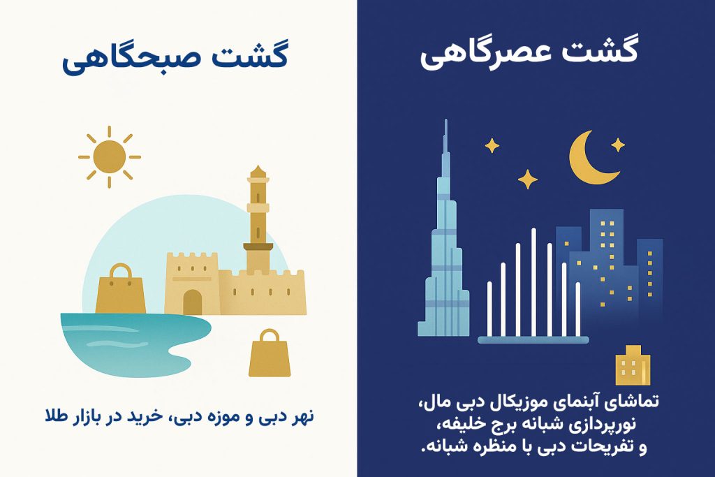 - گشت شهری صبح: بازدید از جاذبههای تاریخی مثل نهر دبی و موزه دبی، خرید در بازار طلا و ادویه.
