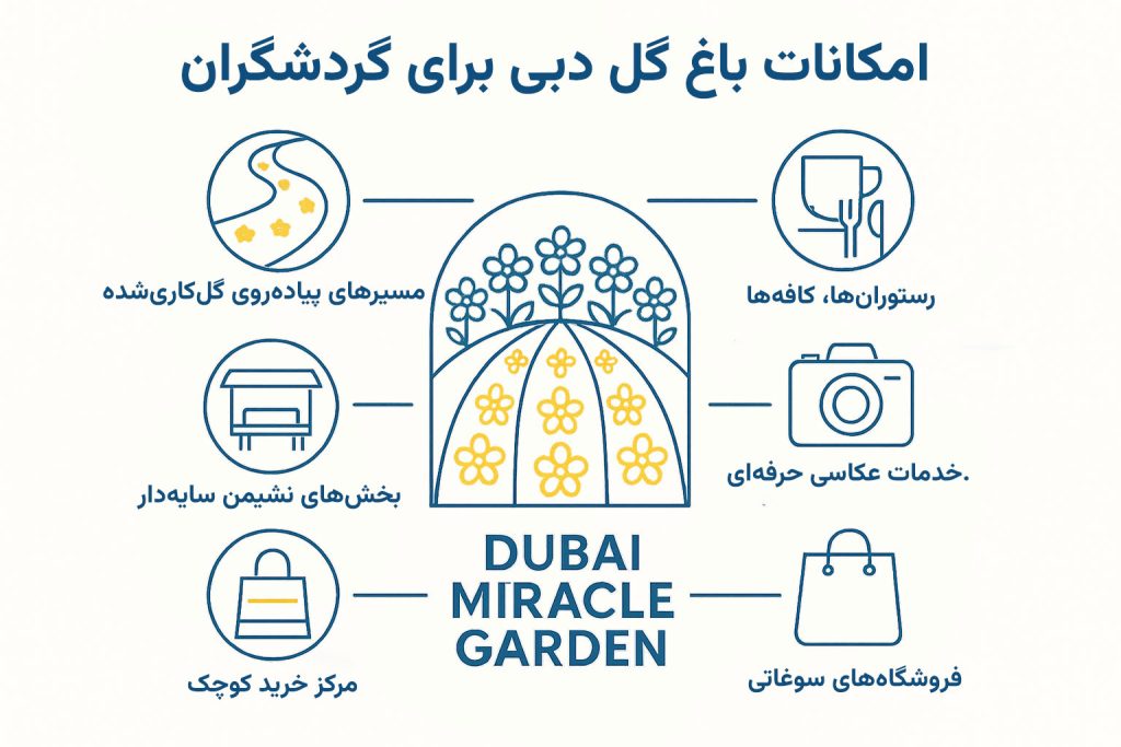 امکانات باغ گل دبی برای گردشگران چیست؟