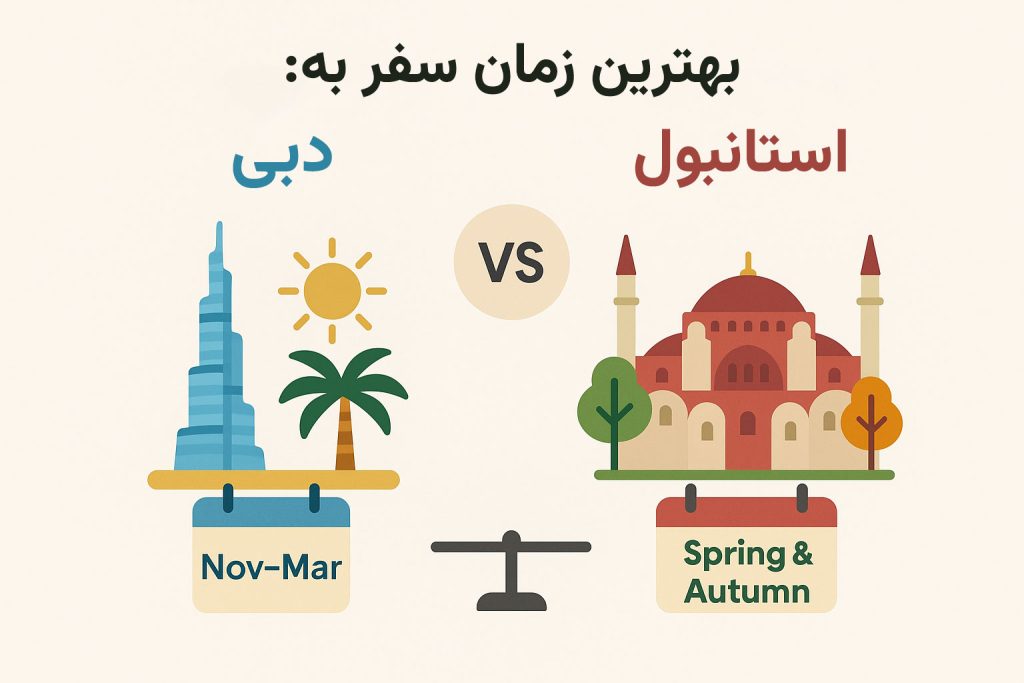 - بهترین زمان سفر به دبی پاییز و زمستان است؛ بهترین فصل سفر به استانبول بهار و پاییز.