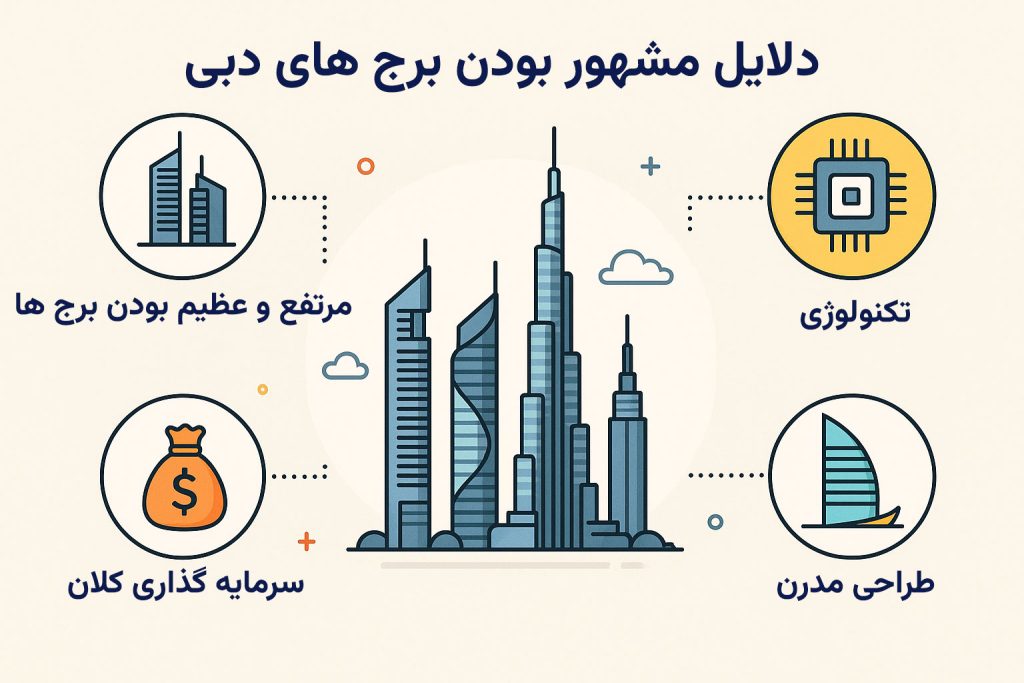 - برجهای دبی ترکیبی از معماری نوین، اقتصاد قدرتمند و گردشگری جهانی هستند.