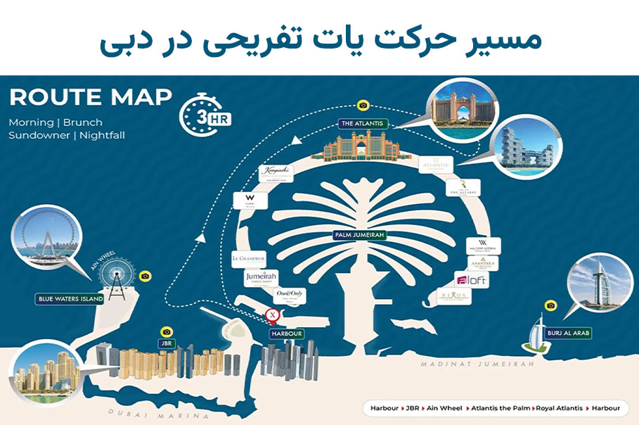 مسیرهای تورهای یات معمولاً از مارینا دبی آغاز میشوند و به سمت نخله جمیرا، آتلانتیس پالم، برج العرب، و عین دبی حرکت میکنند.
