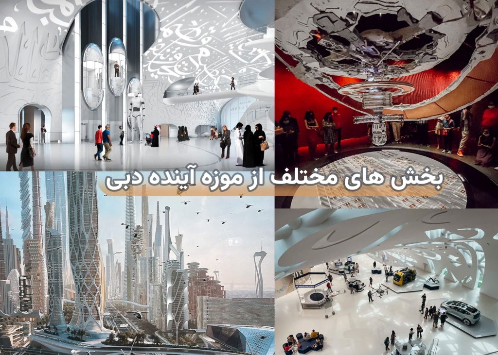این موزه از چندین بخش تشکیل شده که هر کدام موضوعی خاص را به نمایش میگذارند. بخشهای مختلف موزه آینده دبی شامل نمایشگاههایی درباره فضا، رباتیک، هوش مصنوعی، سلامت و محیطزیست هستند.
