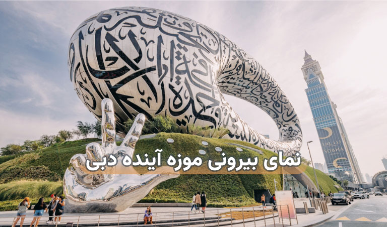 نمای بیرونی موزه و متن روی موزه آینده دبی