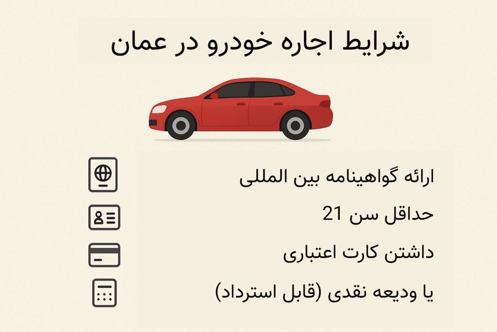 شرایط اجاره خودرو در عمان ساده است اما باید چند نکته را بدانید. حداقل سن برای اجاره خودرو معمولاً ۲۱ سال است و داشتن گواهینامه معتبر الزامی است. برخی شرکتها ممکن است برای اجاره ماشینهای لوکس حداقل سن ۲۵ سال را تعیین کنند.
