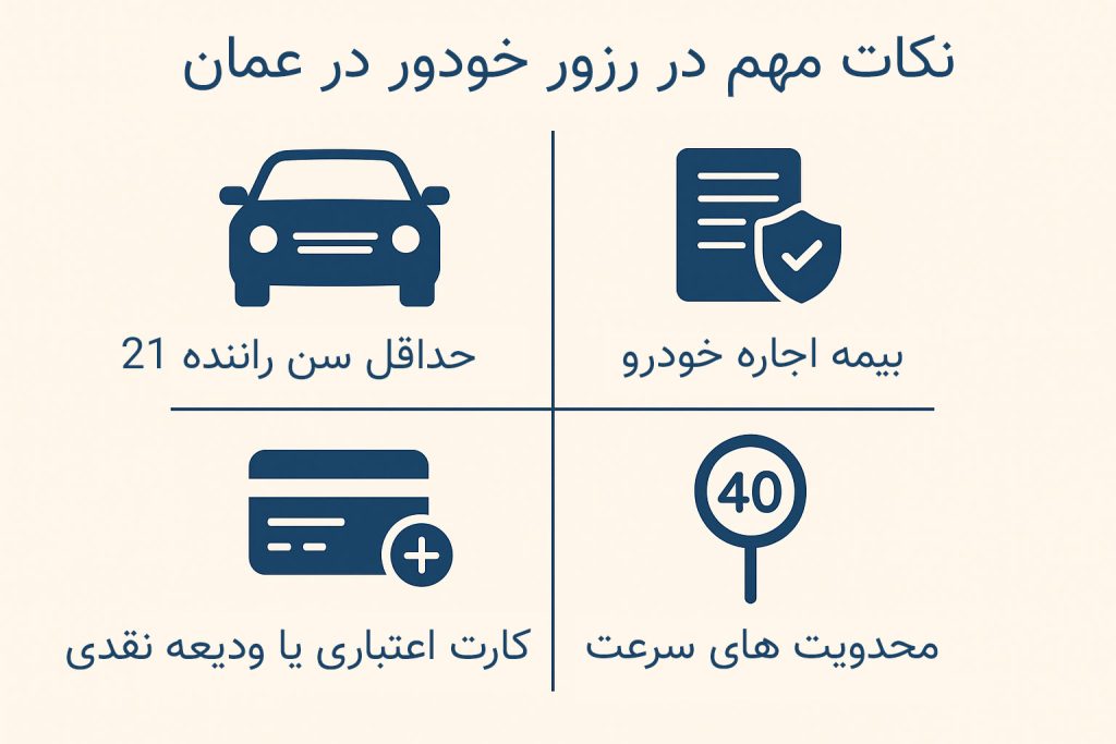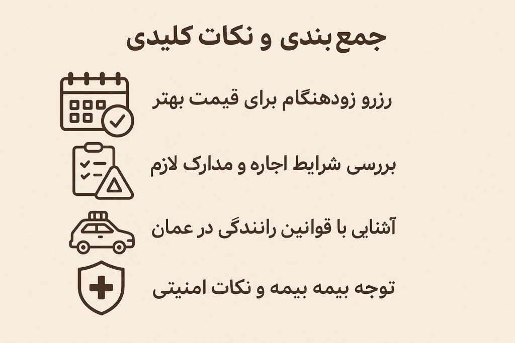 در پایان، مهمترین نکات اجاره خودرو در عمان عبارتند از: