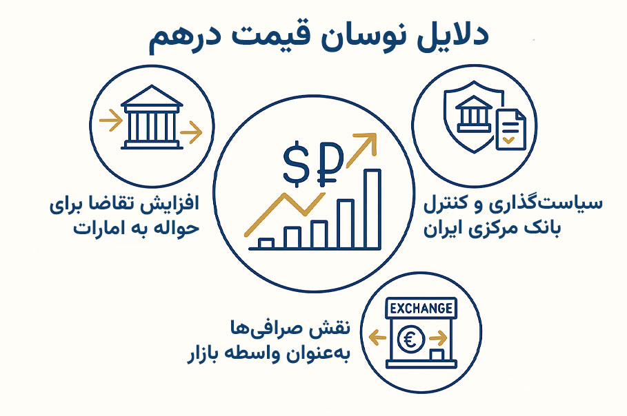 - نوسانات بازار آزاد و سیاستهای بانک مرکزی ایران مهمترین عوامل تغییر نرخ درهم هستند.